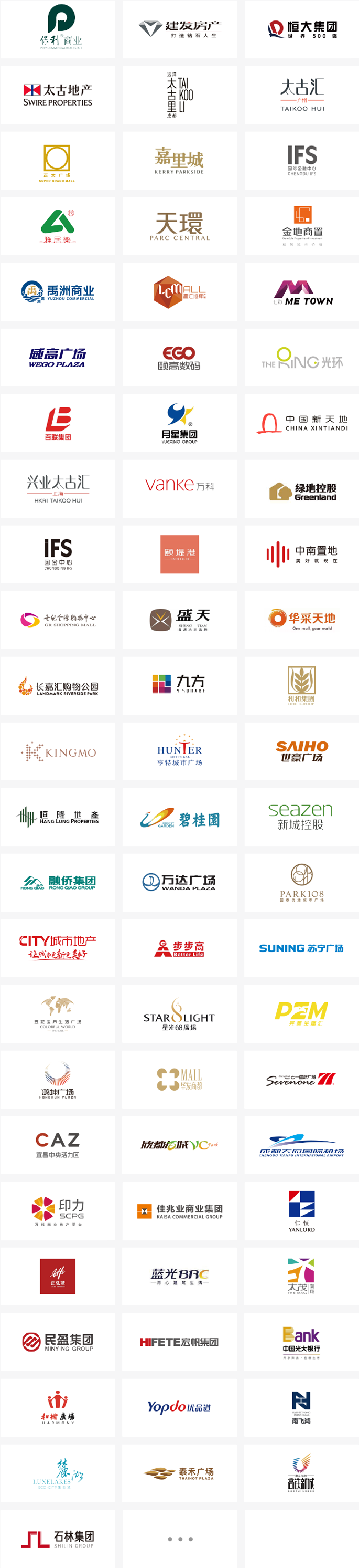 項(xiàng)目包括:佛山水城保利MALL、廣州中環(huán)時(shí)光里、廣州克洛維時(shí)光里、慈溪宗漢保利MALL、上海徐匯時(shí)光里、中山港口保利廣場、武漢洪山保利廣場、南充保利MALL、合肥瑤海保利廣場、天津和平保利廣場、若比鄰項(xiàng)目等100余個(gè)項(xiàng)目。