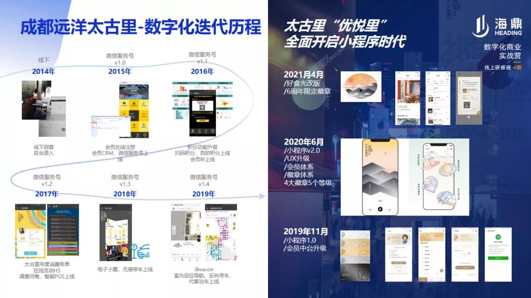 對于會員建設,海鼎科技以成都遠洋太古里的案例進行了分享。遠洋太古里在2014年剛開業時,是通過線下進行運營,2015年后開始建設微信公眾號,后來又從訂閱號升級為服務號,將服務號作為會員服務的載體、將訂閱號作為內容運營主題。2019年,成都遠洋太古里的會員對外窗口由服務號升級為了小程序,從而形成了訂閱號內容運營、服務號內容營銷、小程序會員服務的線上運營平臺架構。