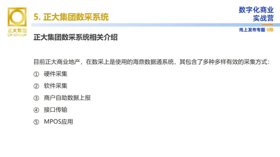 向陽先生表示,目前正大商業(yè)使用的是海鼎數(shù)據(jù)通系統(tǒng),這其中包含了多種有效的采集方式,如:硬件采集、軟件采集、商戶自助數(shù)據(jù)上報(bào)、接口傳輸、MPOS應(yīng)用等。