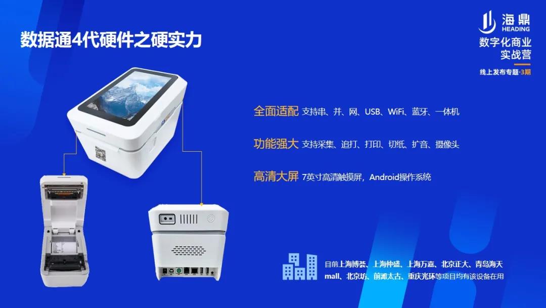 目前,海鼎科技數(shù)據(jù)通4.0產(chǎn)品已經(jīng)在博薈廣場、北京正大廣場、海天mall、前灘太古里、重慶光環(huán)購物公園等國內(nèi)知名商業(yè)體中投入使用。