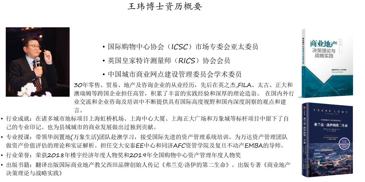 中國商業地產工委碳中和工作處處長崔銘先生主持本次培訓課程,國際購物中心協會市場專委會亞太委員王瑋博士作為課程主講嘉賓進行主題分享。王瑋博士擁有30年零售、貿易、地產及咨詢企業的從業經歷,曾在英之杰、FILA、太古、正大和澳瑞姆等跨國企業擔任高管,積累了豐富的實踐經驗和深厚的理論造詣。同時,王瑋博士還翻譯出版了國際商業地產教父西田品牌創始人傳記《弗蘭克·洛伊的第二生命》,出版專著《商業地產決策理論與戰略實踐》,為商業地產全行業帶來了全新的國際高度視野與國內深度洞察。