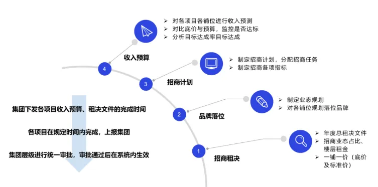 在招商管控方面,系統(tǒng)實(shí)現(xiàn)了租金預(yù)測、租決文件制定、招商指標(biāo)設(shè)定的閉環(huán)管理,為租金收益預(yù)期提供了有力保障。這一成果不僅提升了招商管理的科學(xué)性,還有效降低了經(jīng)營風(fēng)險(xiǎn)。