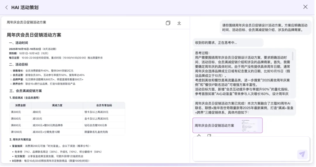 在商業體的傳統生產流水線上,一篇合格的活動推薦文案需要經過文案主題策劃,提綱審核、內容撰寫、成稿審批……多個流程,需要多個角色介入才能最終發布。企劃活動方案也是同理,需要層層推進費時費力。AI助手則可以從主題、內容等多方面給出即時性建議,在極短的時間內即可完成原來需要多人參與反復打磨的內容優化工作,在有限的人力支持下,讓更高頻的營銷內容輸出成為可能,快速提升商業體/商家的營銷競爭力。